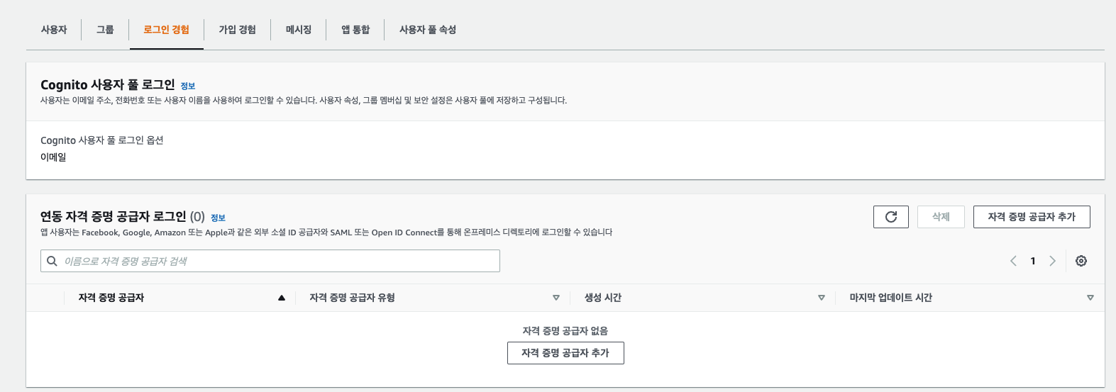 사용자풀이름을 클릭하고 로그인 경험으로 오게 되면 아래와 같이 자격 증명 공급자 추가가 있다.