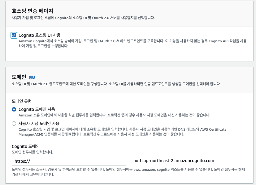 우리는 소셜 로그인을 사용할 것이기 때문에 호스팅 인증페이지 체크박스를 체크해주고 Cognito 도메인을 생성해준다.