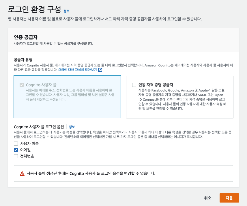 로그인 환경 구성에서 Cognito 사용자 풀은 디폴트로 설정이 되어있다.