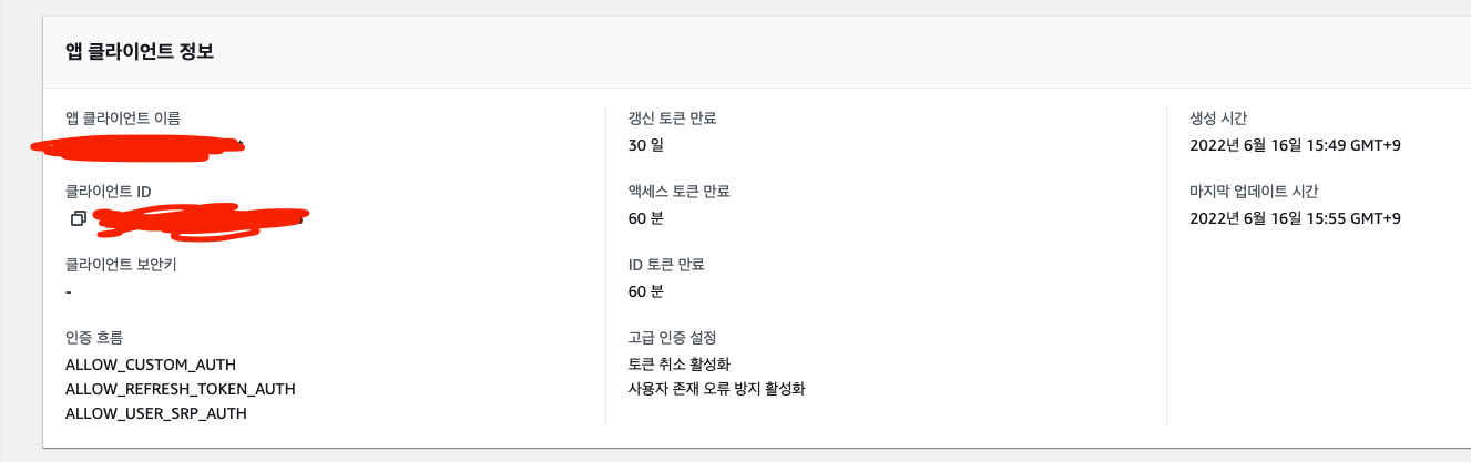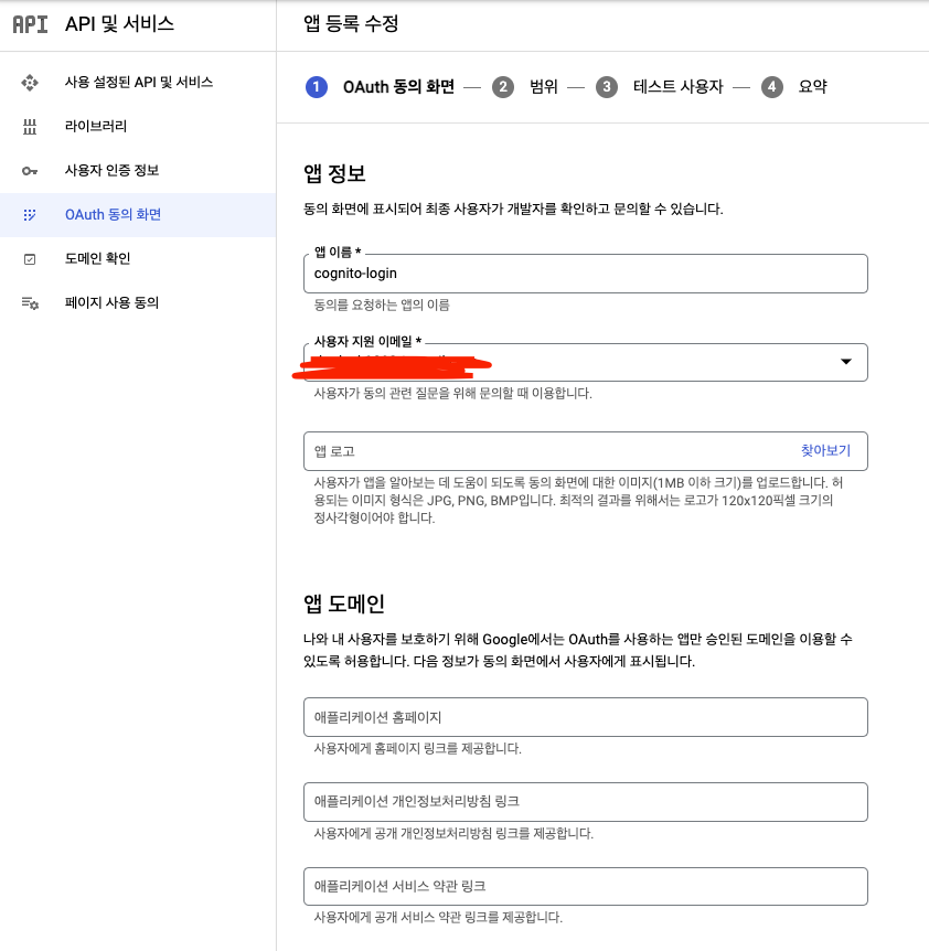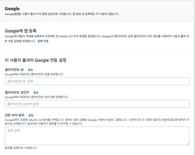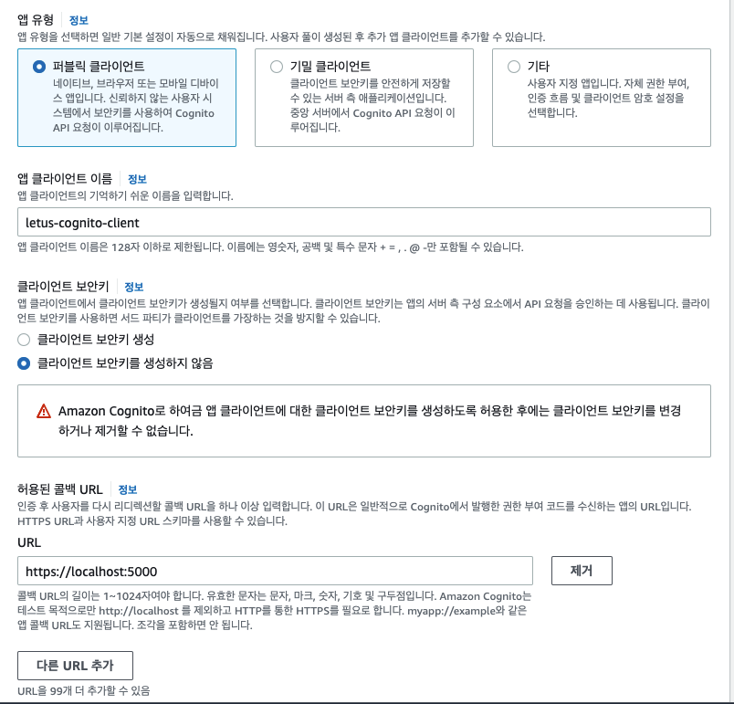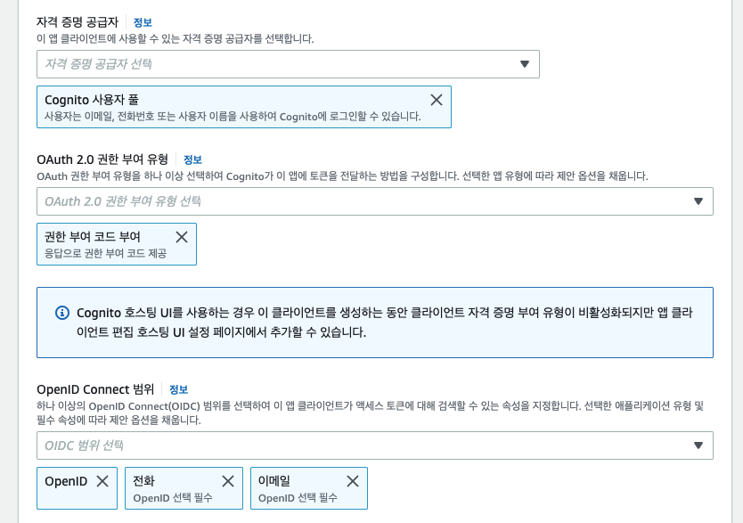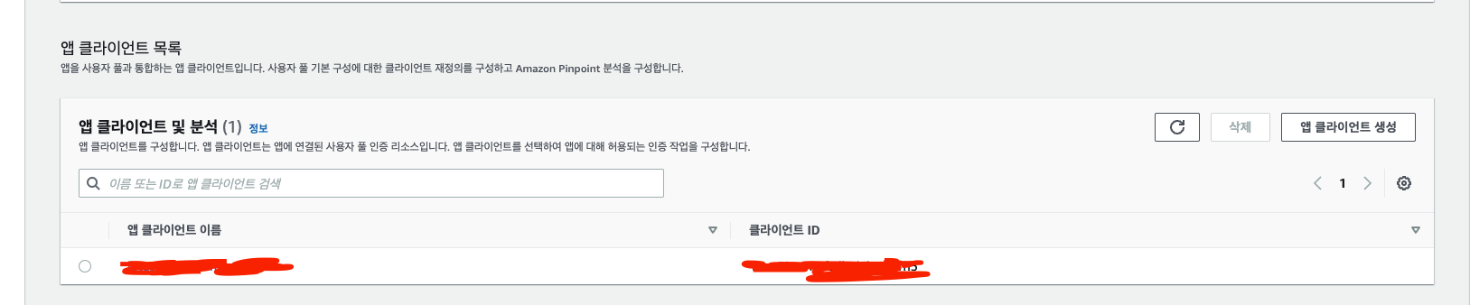 리디렉션 URI : https://내앱이름.auth.ap-northeast-2.amazoncognito.com/oauth2/idpresponse