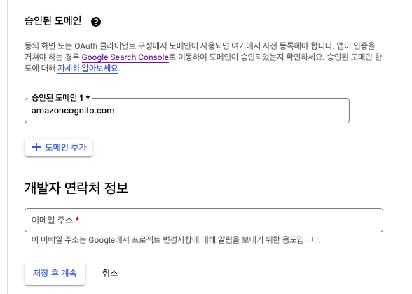 승인된 도메인은 amazoncognito.com 을 넣어주고 저장한다.
