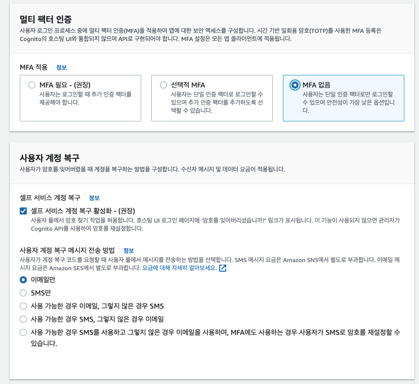 아마존 콘솔 로그인 -> Cognito 검색 -> 사용자 풀 생성으로 들어가면