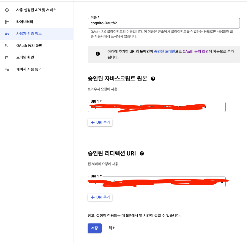 승인된 자바스크립트 원본은 아까 Cognito 도메인을 입력해주고