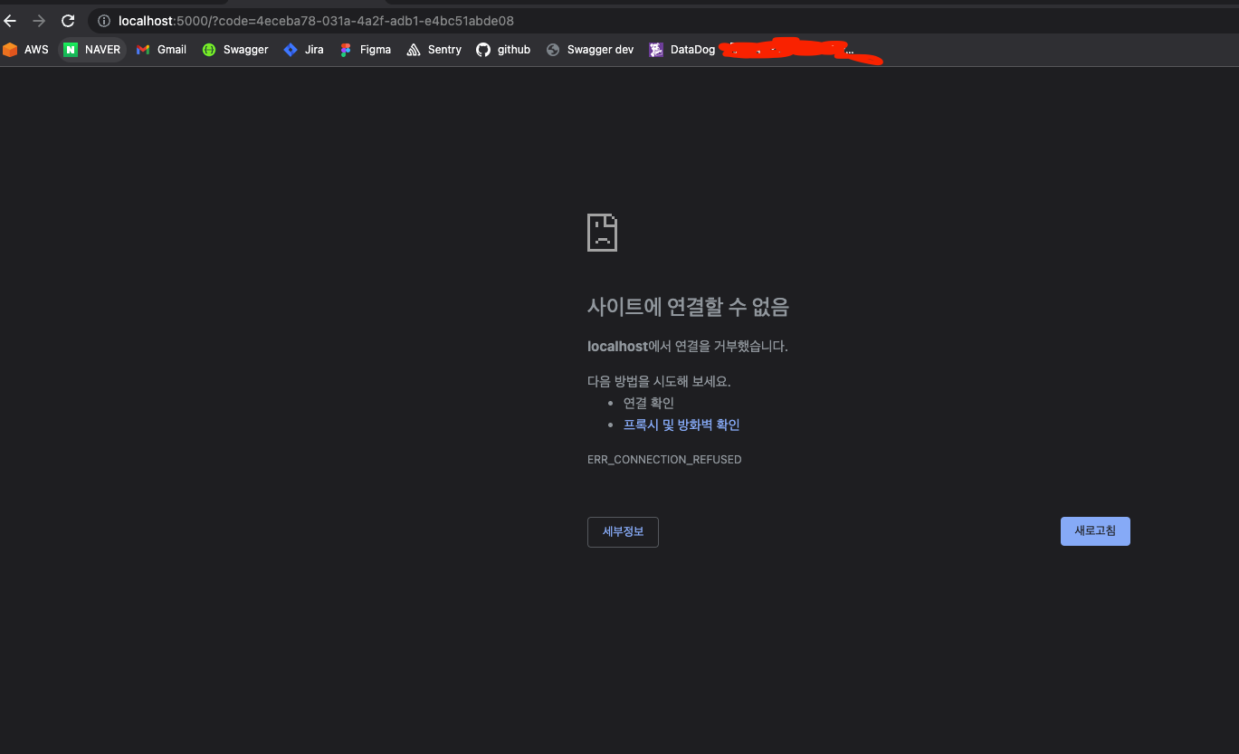 이렇게 에러가 뜨게 된다. 하지만 URL 을 잘보면 뒤에 code 값이 쿼리로 날라온걸 볼수 있다.