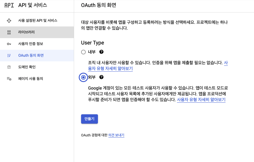 Google Cloud Platform 에서 프로젝트를 생성한후 사용자 인증정보를 설정해야 한다.